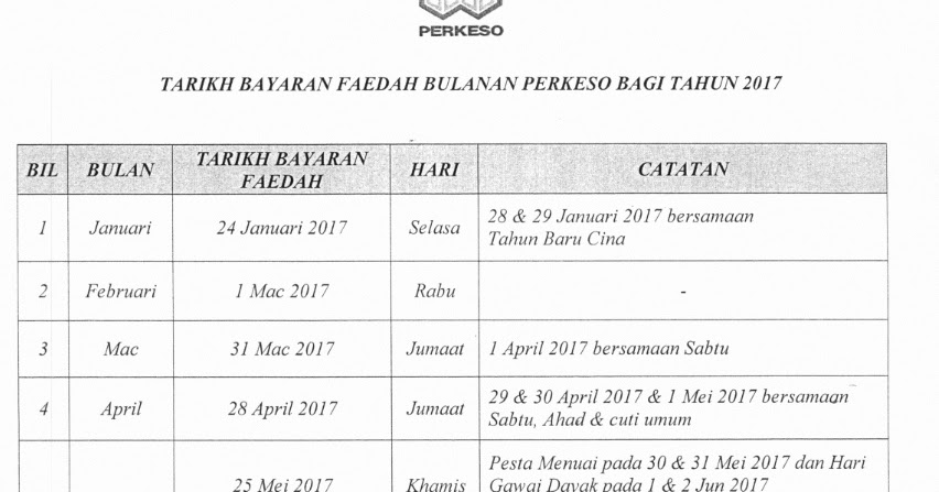 Related : Jadual Pembayaran Perkeso 2016 : Jadual tarikh pembayaran faedah bulanan perkeso tahun 2018..